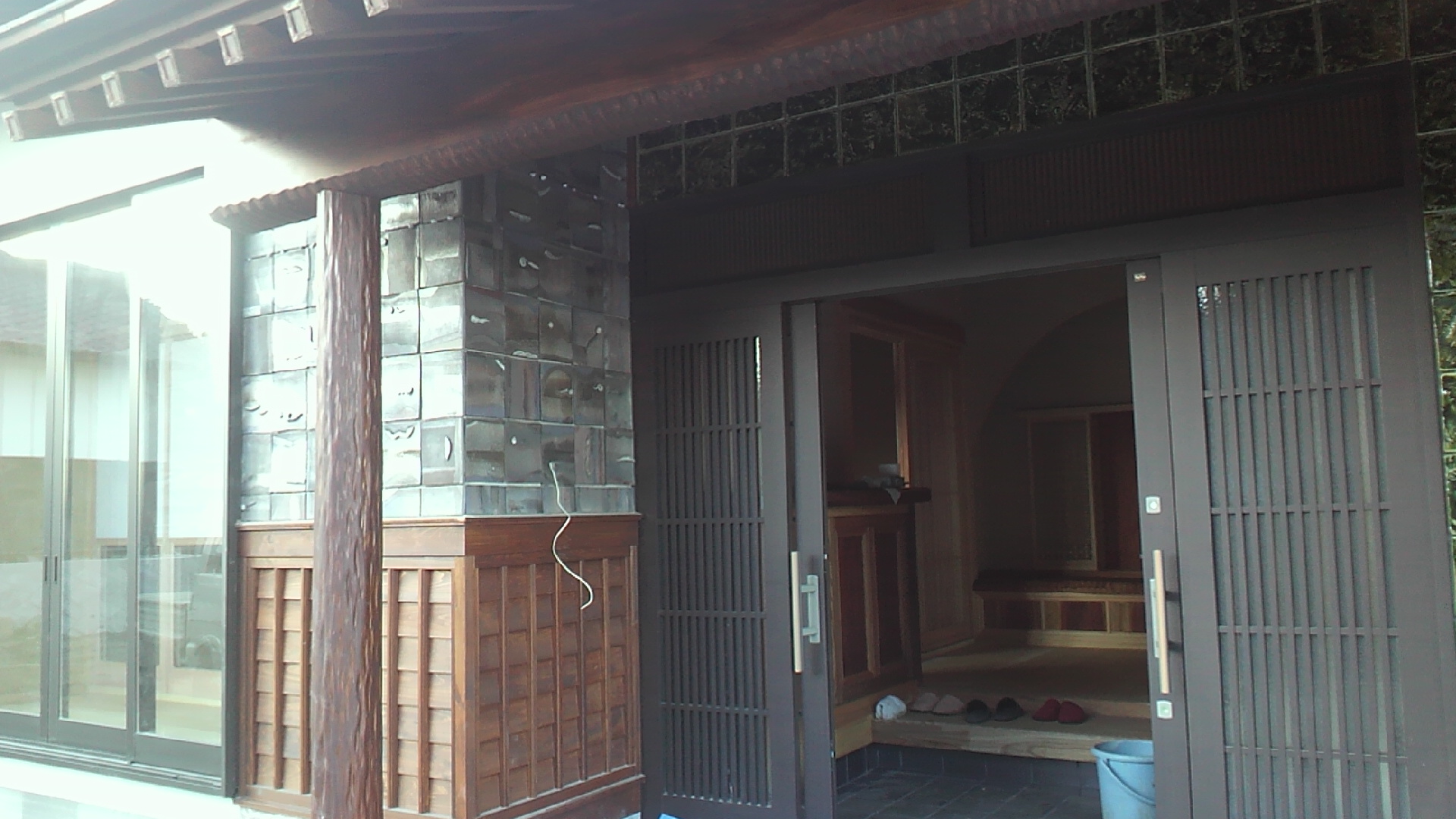 外玄関が完成しました。 笠間焼きの陶板を貼りました。建て主さんが知り合いの陶芸作家さんに注文して作ってもらった陶板になります。