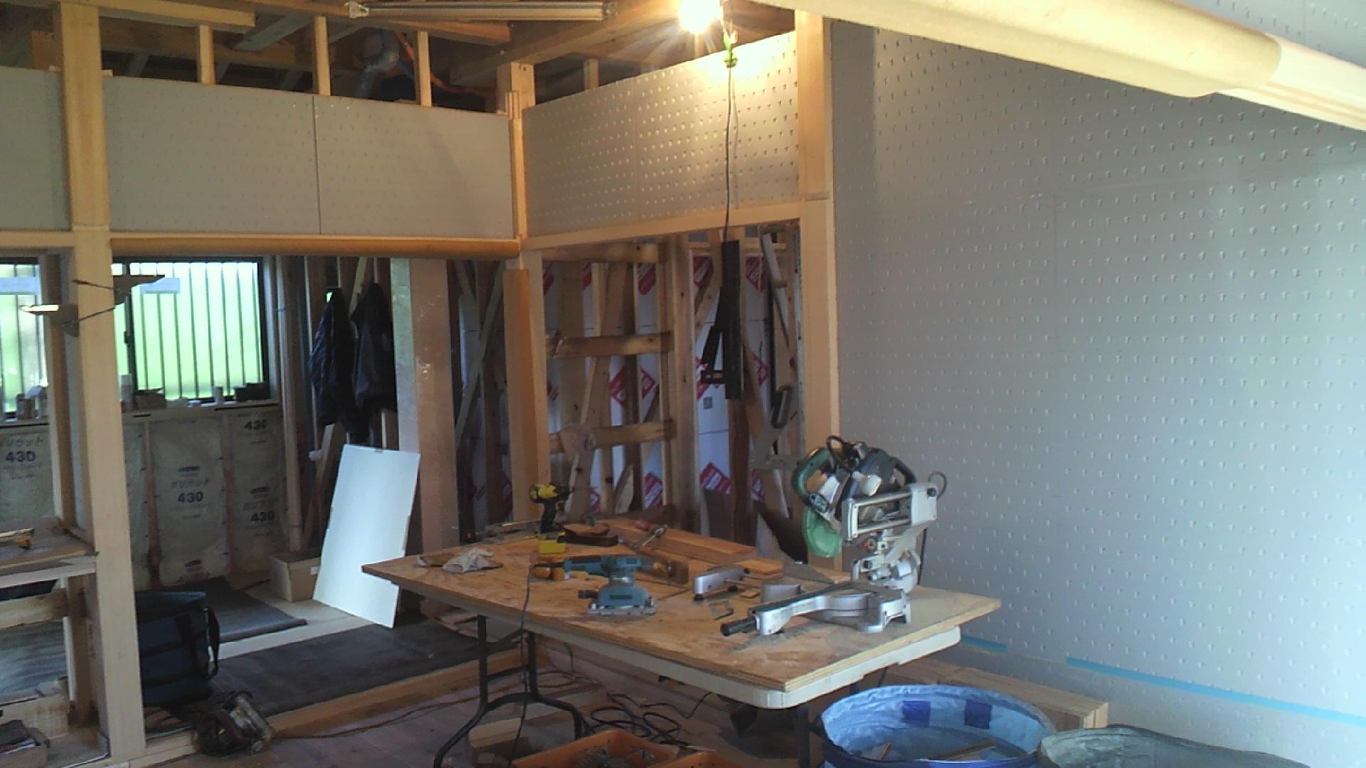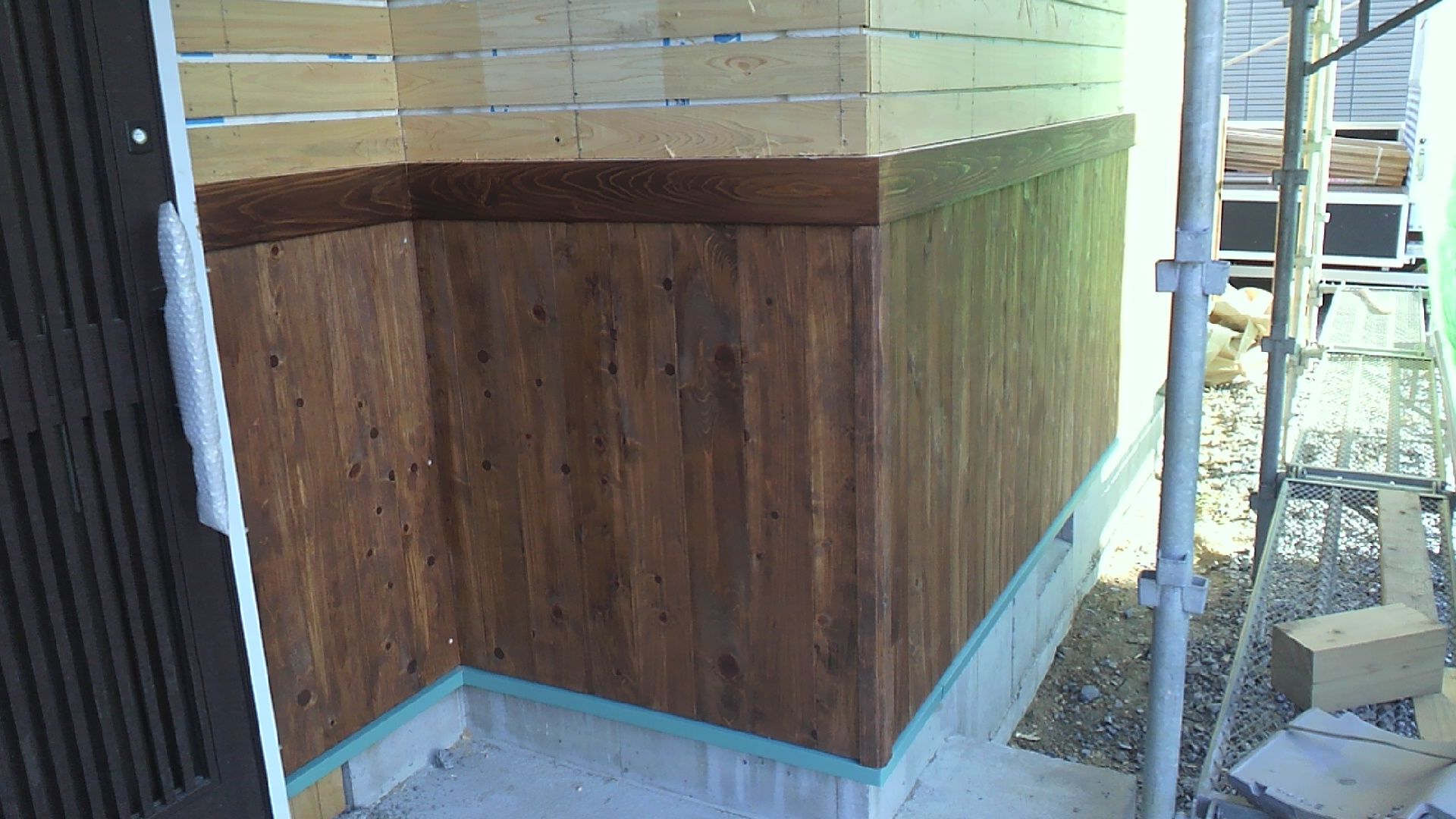 外部の腰板が貼りあがりました。檜の縁故を使用しました。腰板は屋根材と同じ色に塗装しました。