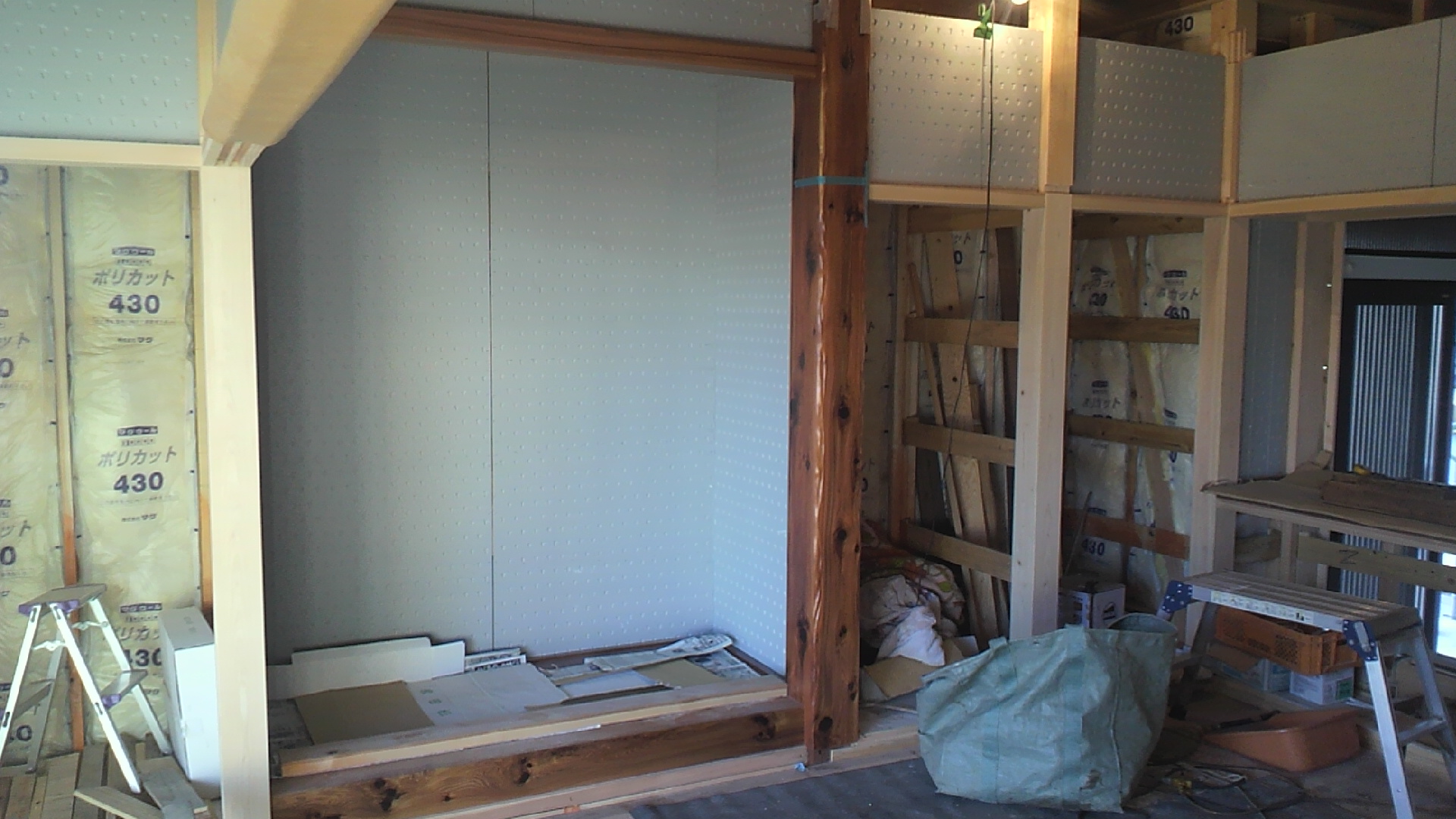 和室の壁のボードを貼りあがりました。床柱には日光杉を使用しました。