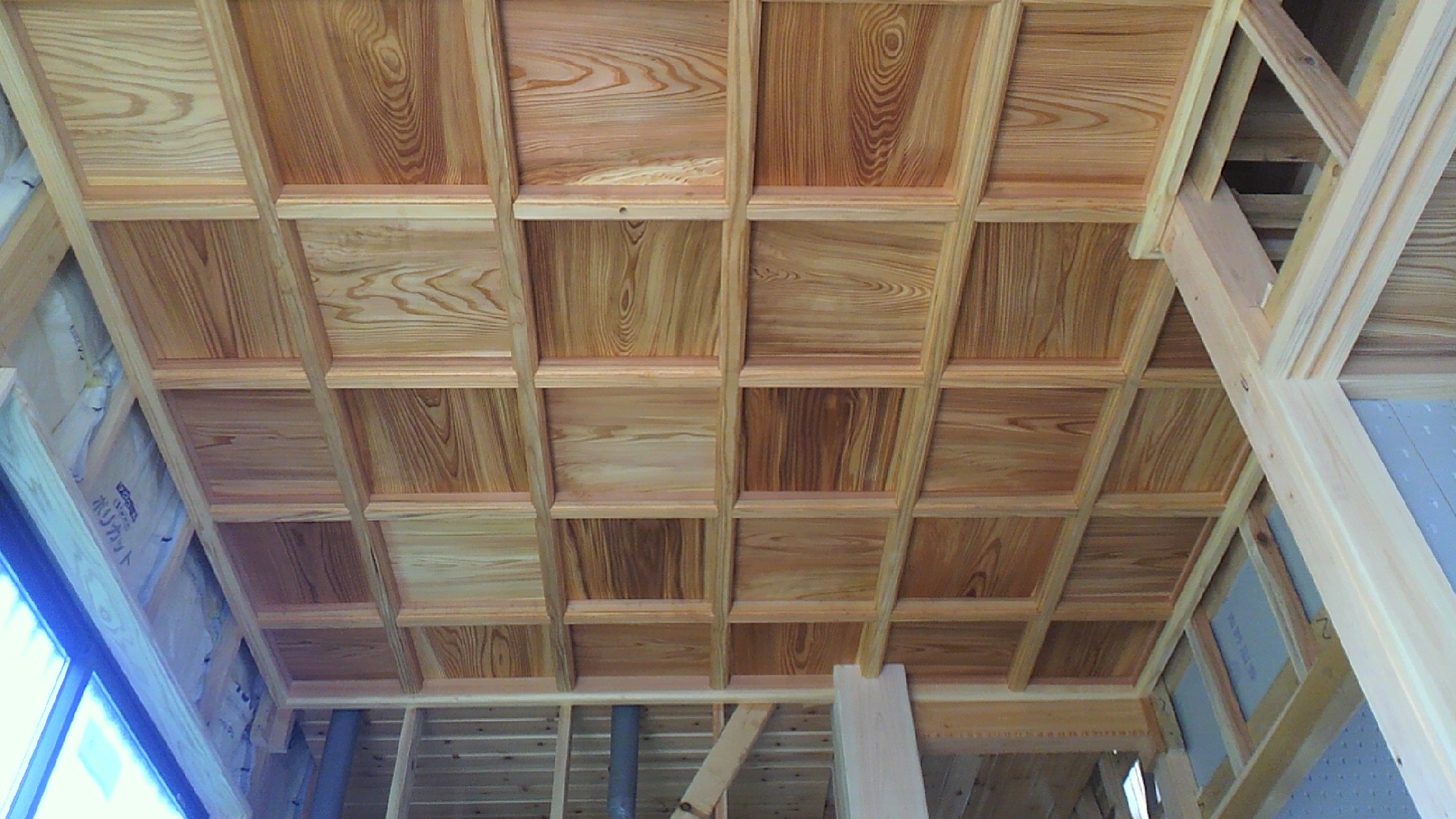 玄関の天井が完成しました。天井は格子天になります。杉材を使用し油(ボイル油)を塗装しました。