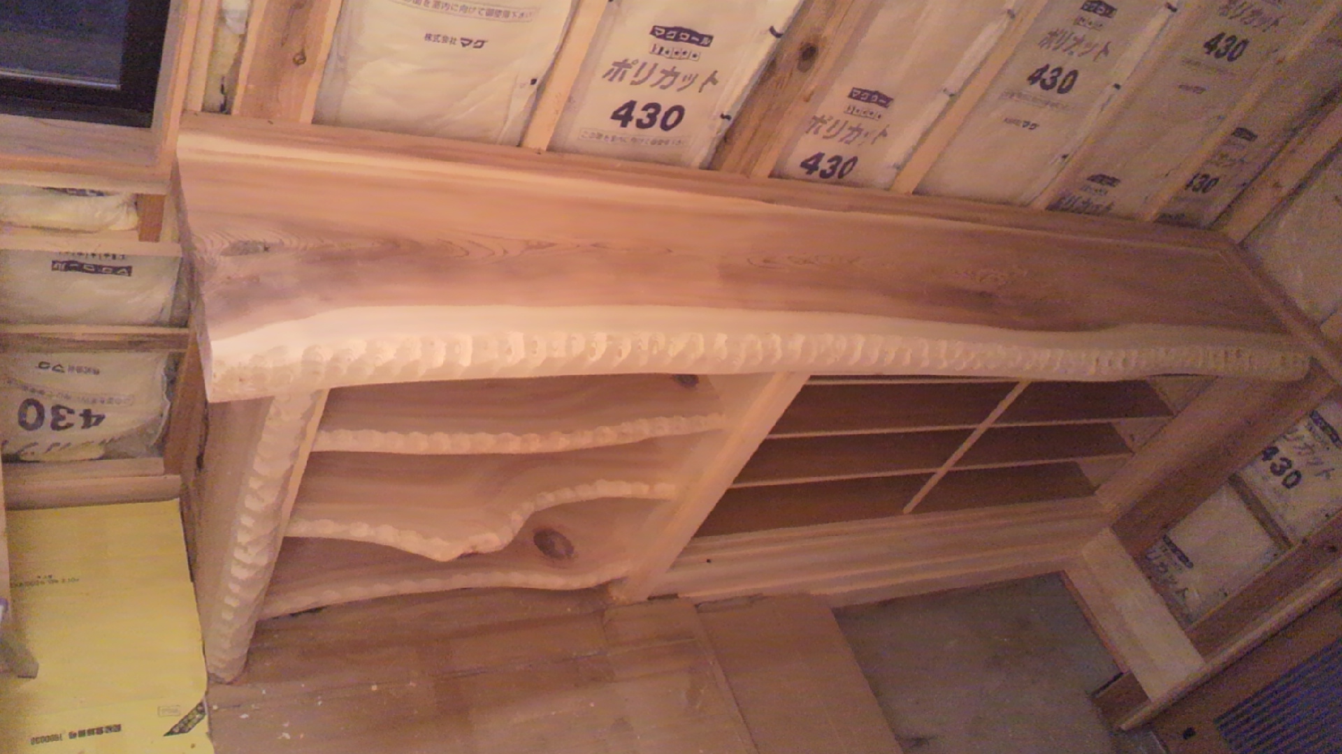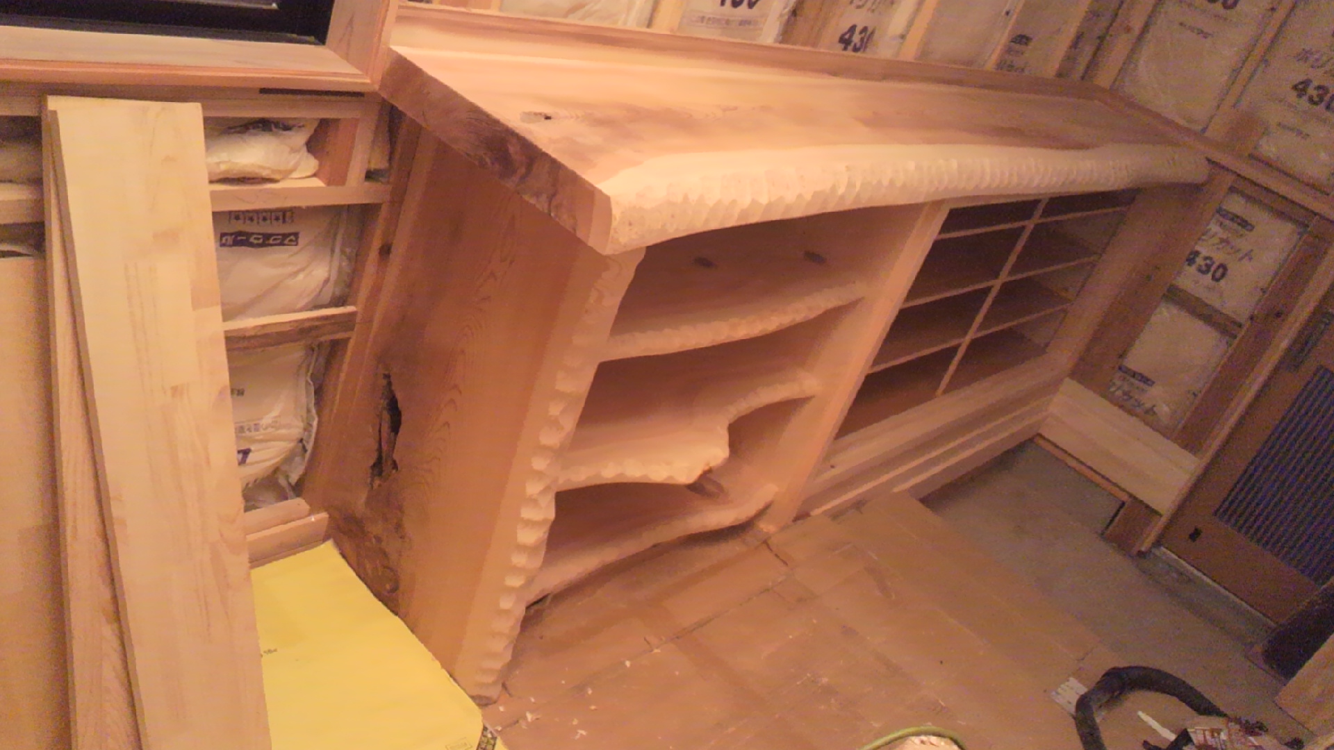 下駄箱が完成しました。杉の無垢材を使用しました。右側が下駄箱で、左側が棚になっています。