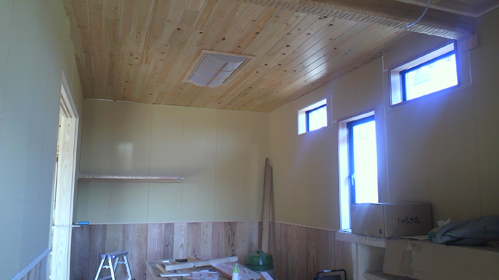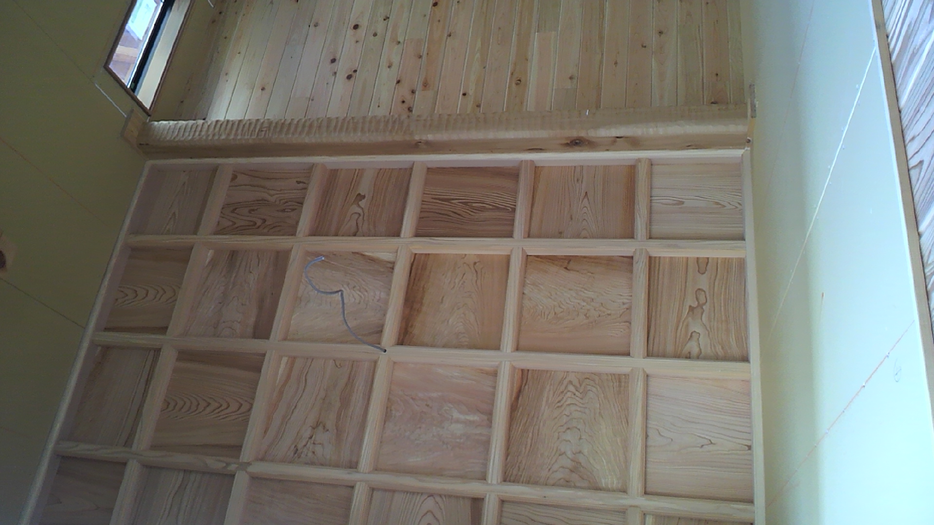 玄関の格子天井が完成しました。壁もボードが貼り上がりました。完成まであと少しです。
