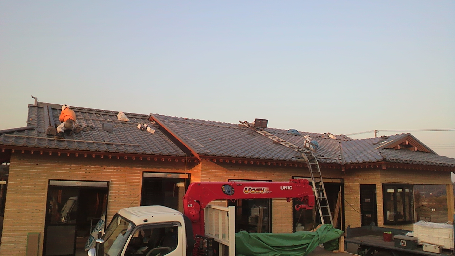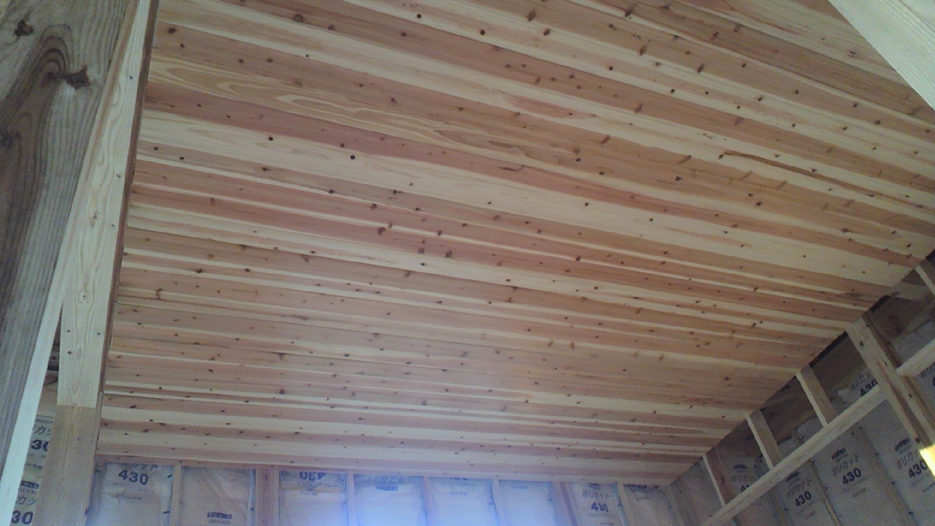 洋間の天井の施工に取りかかりました。天井板は杉の無垢材使用しました。塗装品のため、汚れや日焼けしにくいです!