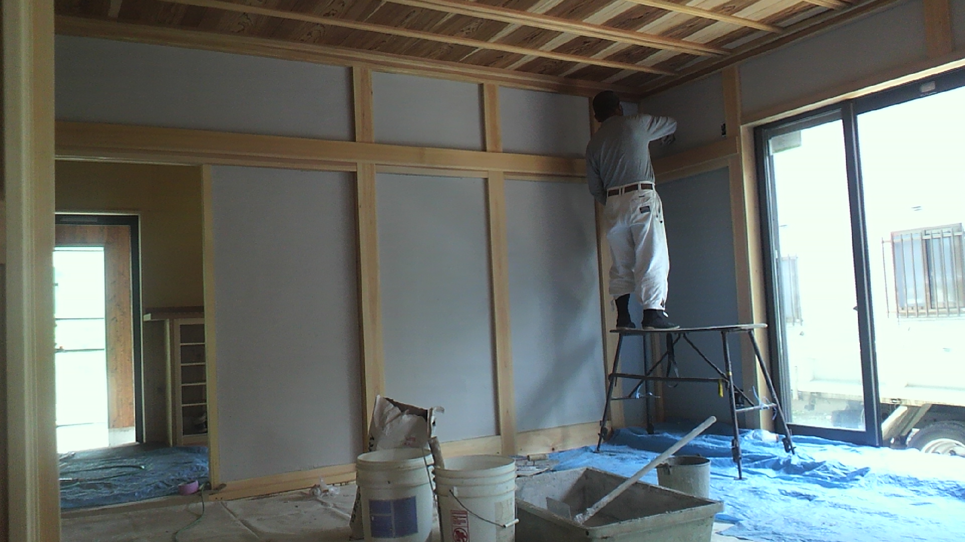 大工工事が終わり、左官さんが和室壁の下塗り中です。よく乾燥をさせたのち、仕上げになります。