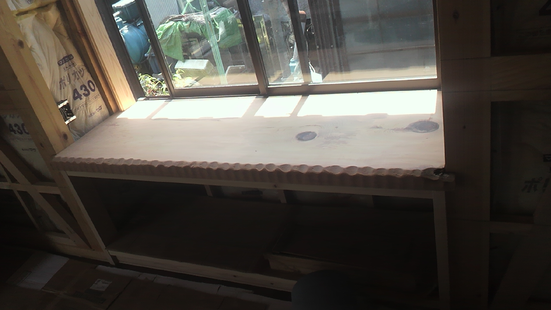 リビングの出窓が完成しました。 天板の板は杉の一枚板を使用しました。 下は地袋になります。