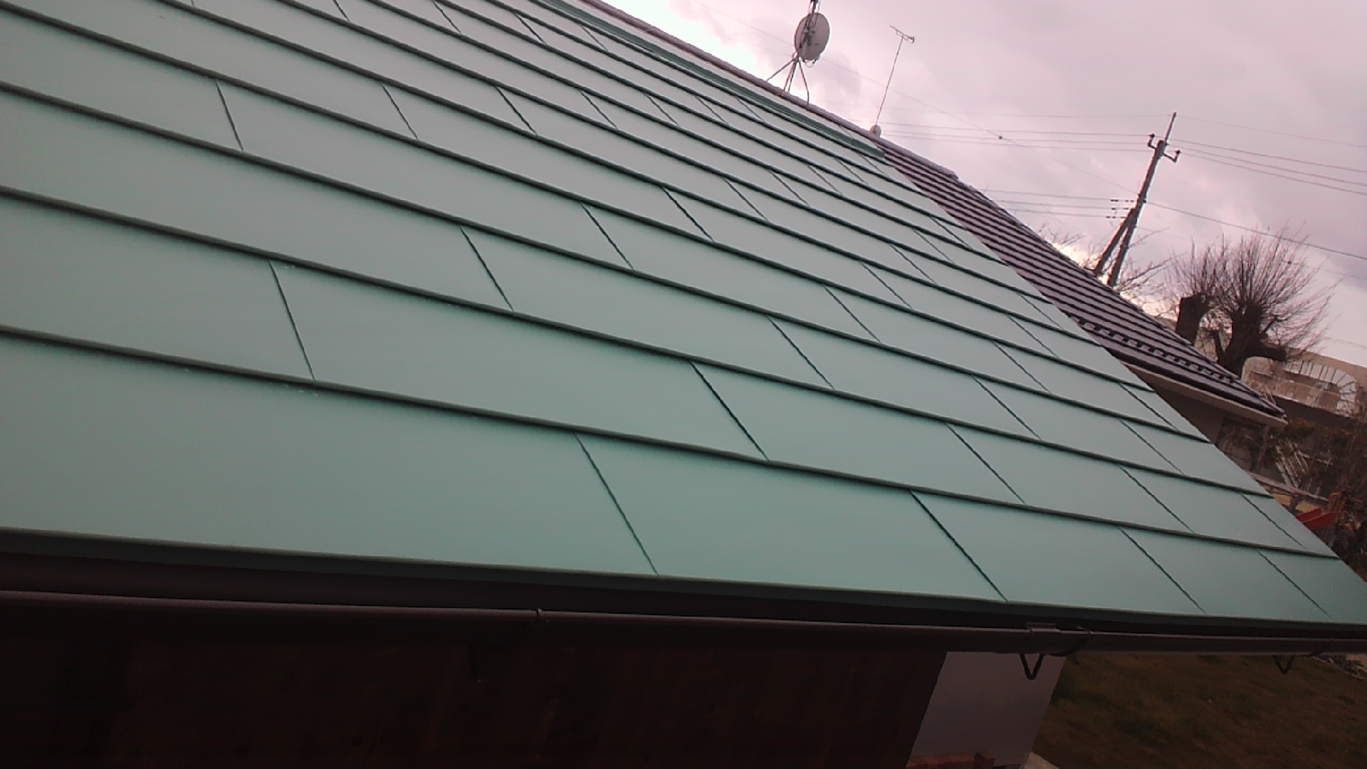 この前建てた物置小屋になります。 屋根はトタンの緑青色で平葺きにしました。 物置の中には棚を作りました。