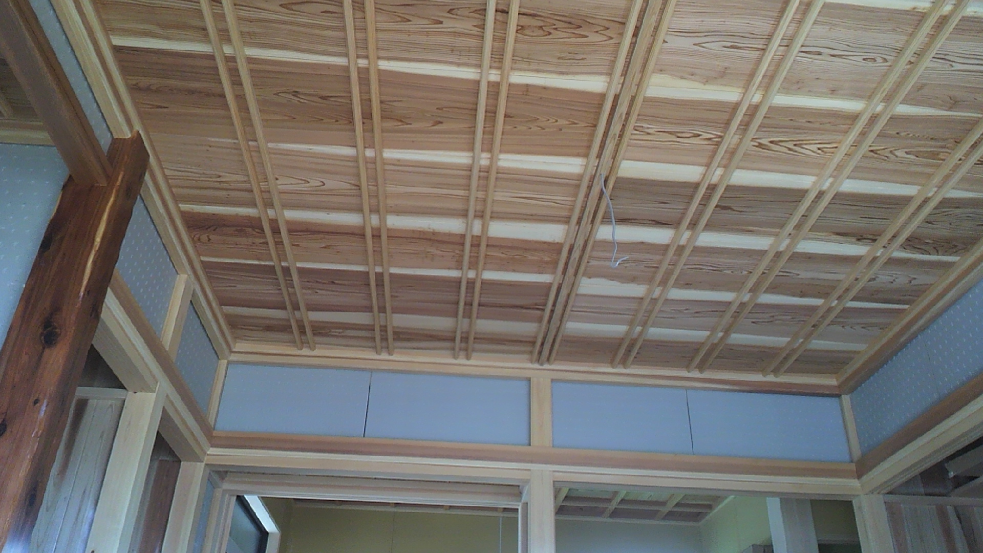 床の間の天井になります。天井板は杉の無垢材を目すかしに貼りました。 大工工事が無事終わりました。これからは下職さんの仕事になります。