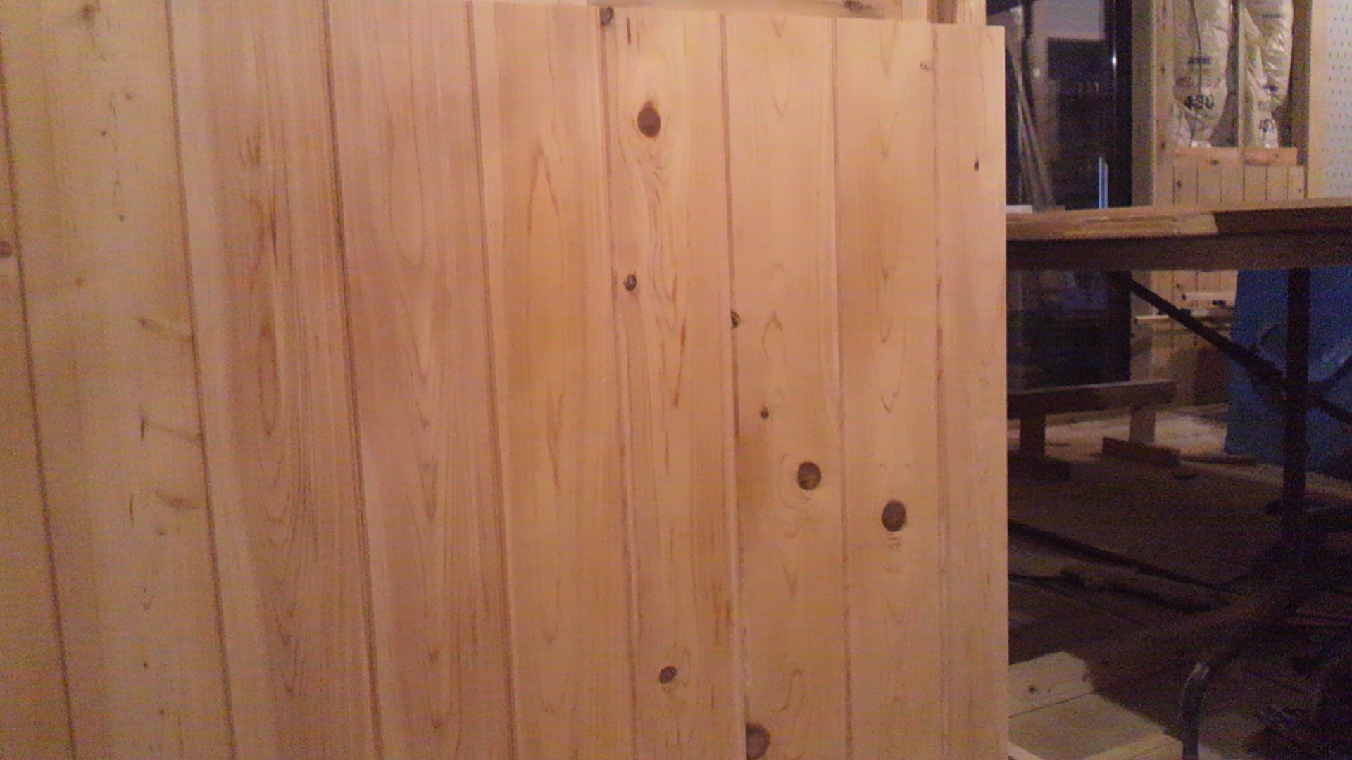 1階洋間の腰板の施工中です。腰板にはサワラ材を使用しています。