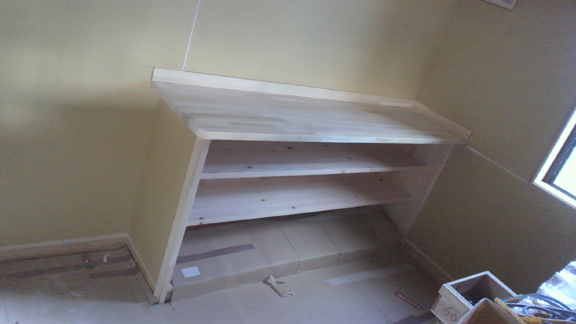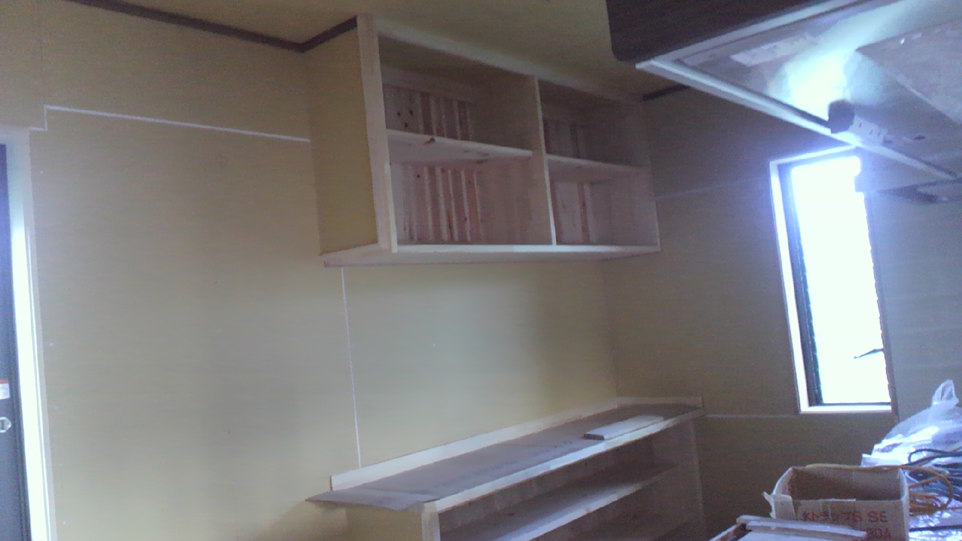 キッチンには作り付けの食器棚を作りました。 シンクにガスコンロを使用したので防災条件の都合上、天井と壁はボードを使用しました。