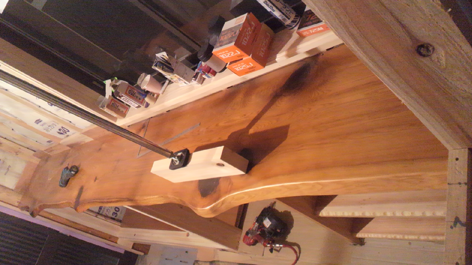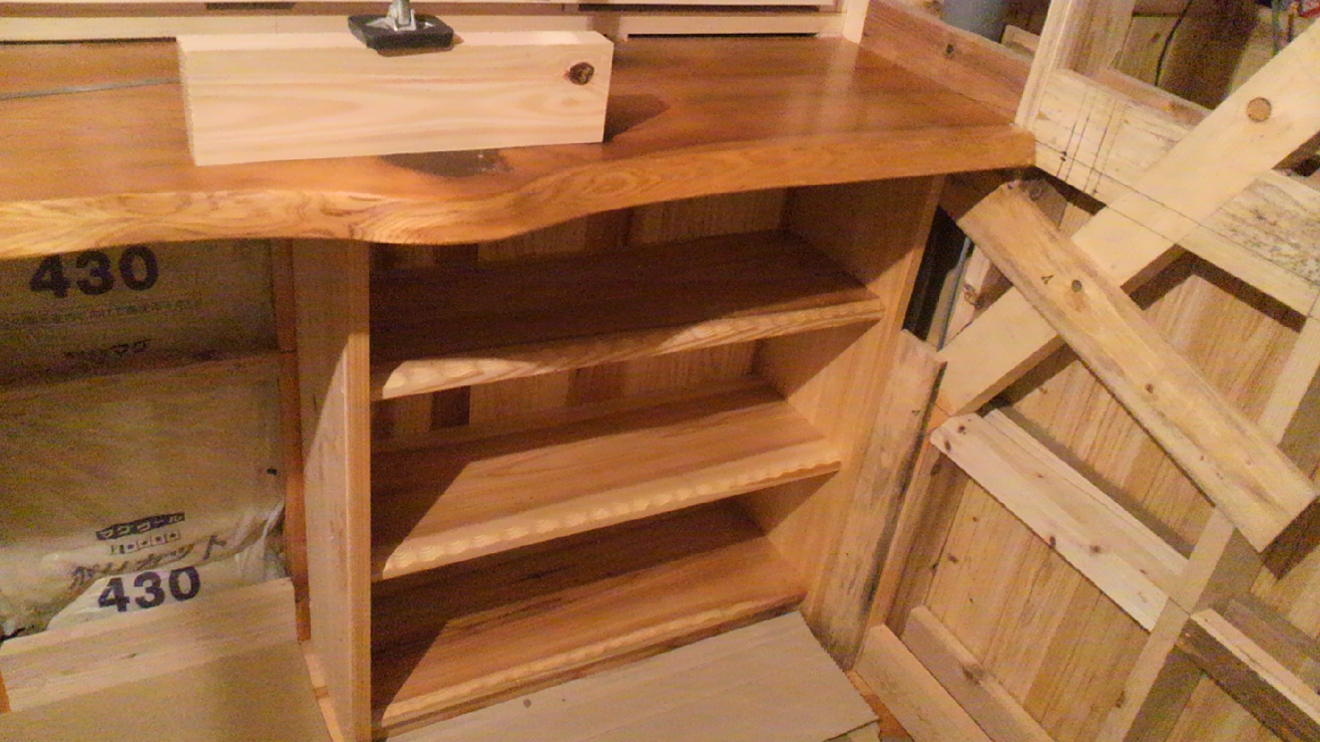 玄関の下駄箱の施工中です。天板には杉の一枚板を使用しました。玄関ホール側には棚を作りました。