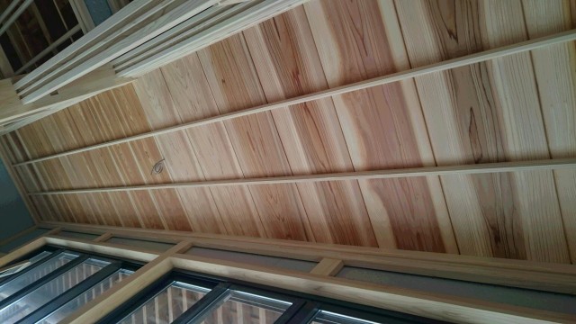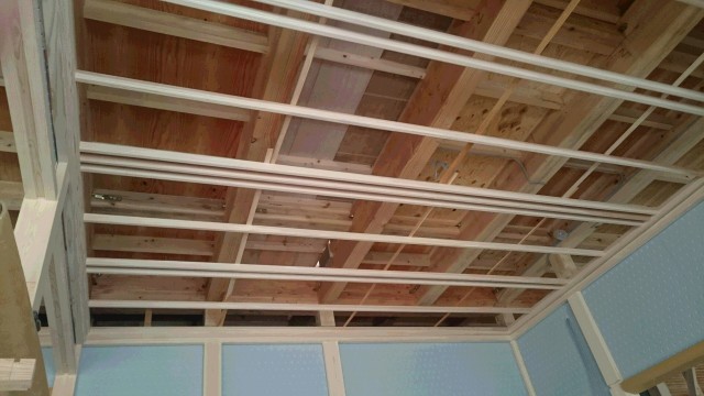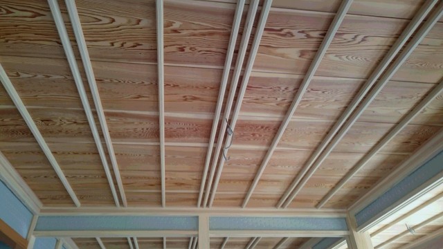 和室前廊下の天井が終わり、和室二間の天井が完成しました。