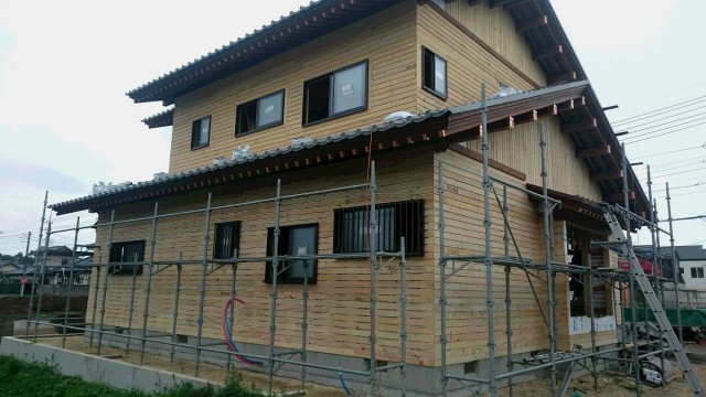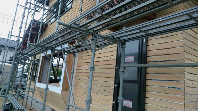 窓口のサッシが付き、1階の外部壁が張上がって来ました。