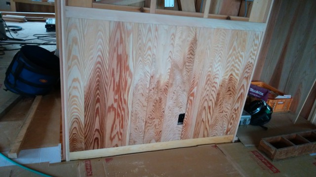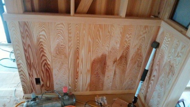 1階の腰板の施工にかかりました。杉材の羽目板を使用しました。