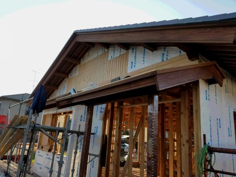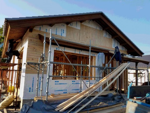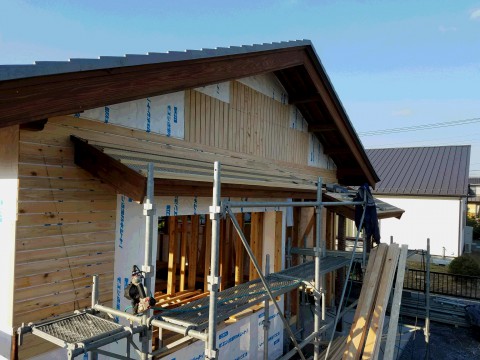出窓と玄関の屋根が完成し外部の板張り中になります。