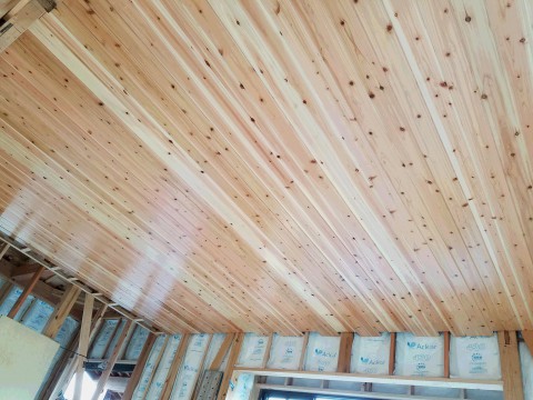 リビングの天井が完成しました。杉の羽目板を使用しました。