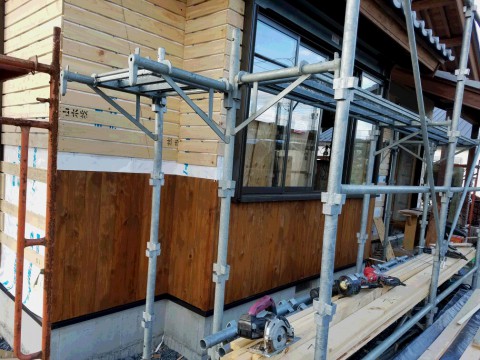 外部壁の腰板の施工にかかり、桧の縁故板を張っていきます。