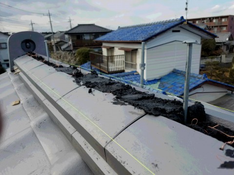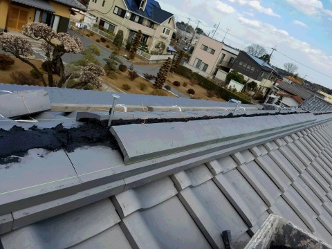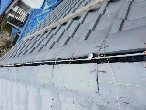 瓦工事が進み棟瓦の施工中です。地震の揺れに耐えれるように杭と皮膚線を使い耐震補強をしております。